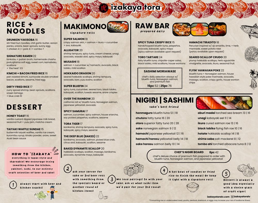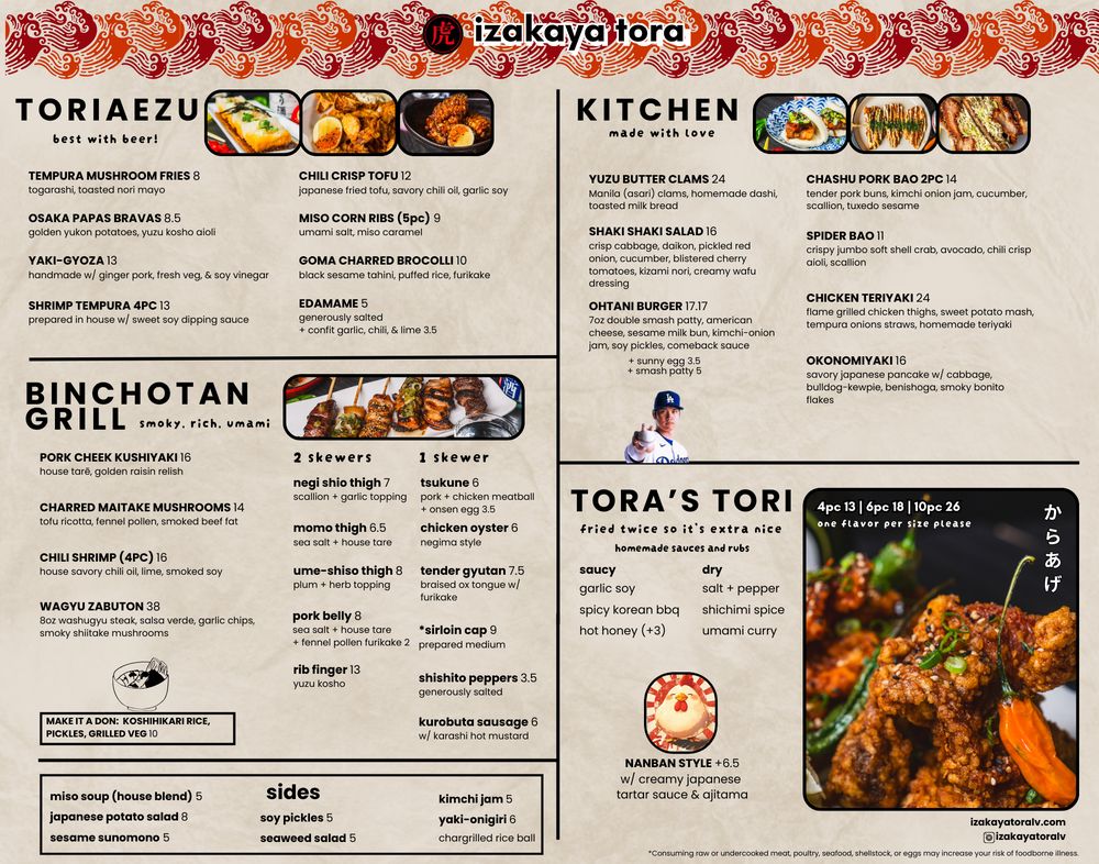 Welcome to Izakaya Tora, a gem nestled conveniently near the Las Vegas Strip. This intimate izakaya offers a vibrant blend of flavors that captivates both locals and tourists alike. Their menu features highlights like Tempura Mushroom Fries paired with toasted nori mayo, and the savory Yaki Gyoza with ginger pork, fresh vegetables, and soy vinegar. The Goma Charred Broccoli, with black sesame tahini and furikake, showcases the restaurant’s commitment to balancing flavors and textures.